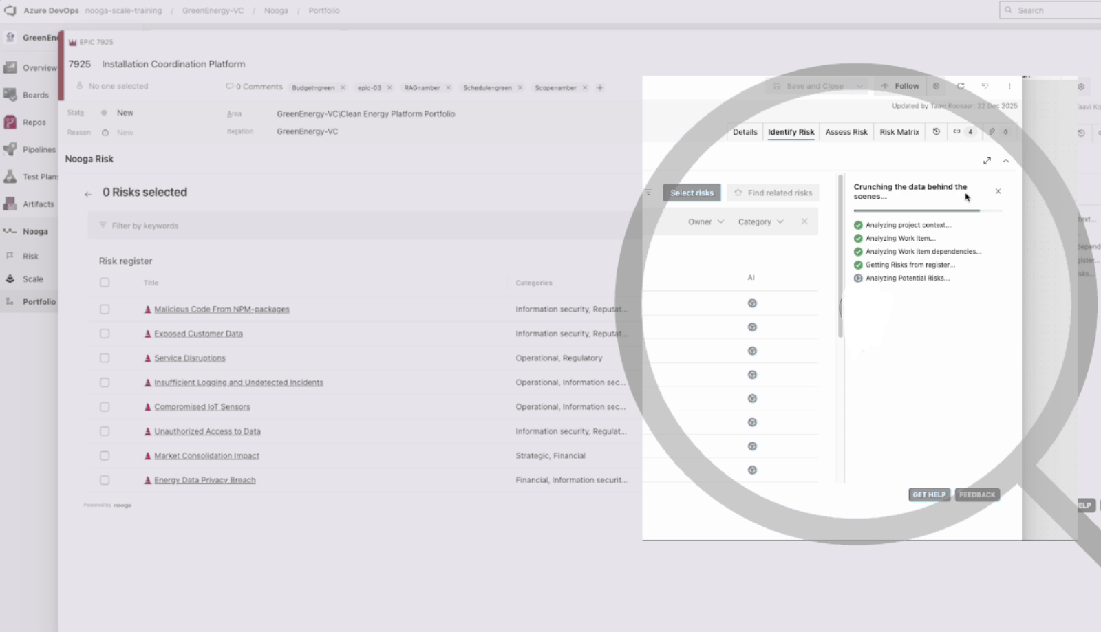 Use our opt-in AI features to analyze work items and identify relevant risks, including root causes and potential effects. Nooga surfaces risks for your team to decide upon, improving risk quality, increasing treatment effectiveness, and saving valuable time.
